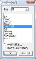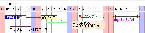 目盛の表示単位や、縮尺の自由度がとても高く設計されています。 上部の目盛の表示は、上段と下段にそれぞれ表示単位(日、週、旬、月、年)を設定でき、表示形式もカスタマイズできます。それとは別に縮尺(スケール)も飛び飛びの値ではなく、スムーズに変更ができるので、思い通りの細かさで工程表(ガントチャート)が作成できます。 また、すぐに切り替え可能な3つの表示モードを備え、そのそれぞれに目盛の設定が個別に行えます。 表示期間は、スクロールバーが左端に来ていてもさらに左にスクロールすることが可能で、自動的に表示期間を連続して拡大します。右端についても同様です。最初に期間を決めて設定したり、拡大するときにいちいち変更する作業は必要ありません。逆に、限定したい場合にはもちろん、表示対象期間を明示的に設定することも可能です。