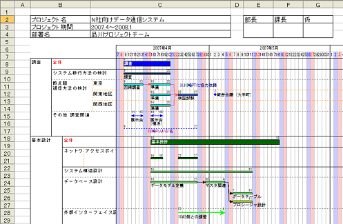 Project Canvasの印刷機能でも、美しい印刷出力が可能です。しかし、スケジュール線表(工程表、ガントチャート)は、仕様書や計画書の一部として他のドキュメントに埋め込みたいケースも多く想定されます。 Project Canvasは「拡張メタファイル」形式で、スケジュール線表を画像としてクリップボードにコピーすることができます。これは、画面キャプチャしたものとは違い、スクロールしないと見えない部分も含まれ、ツールバーなどの余計な画面部品は入りません。また印刷出力を念頭に置いたものであり、拡大してもギザギザが出ることはありません。 拡張メタファイル形式でコピーしたスケジュール線表(工程表、ガントチャート)は、他社製のワープロや表計算ソフトに貼り付けることができます。(例えば、ワードやエクセルでは「形式を選択して貼り付け」というメニューでサポートされています) ▼表計算ソフトへの貼付け例